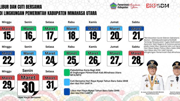 Kepala BKPSDM Kabupaten Minahasa Utara Johanes J.A.C. Katuuk mengatakan berdasarkan Surat Edaran (SE) Menteri Pendayagunaan Aparatur dan Reformasi Birokrasi (Menpan RB) Nomor 2 Tahun 2026 tentang penyesuaian tugas kedinasan bagi pegawai ASN pada masa libur nasional dan cuti bersama Hari Suci Nyepi dan Hari Raya Idulfitri 1447 H, berikut jadwalnya.